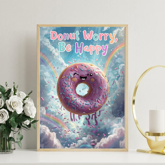 Donut Worry Be Happy Poster | Cute Motivational Art | Whimsical Digital Print