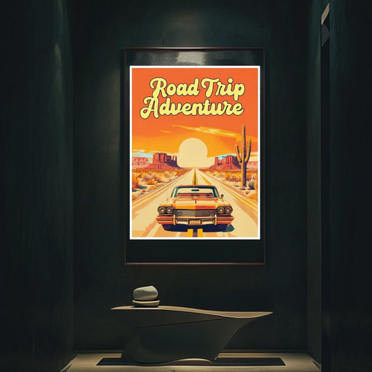 Road Trip Adventure Poster | Vintage Car Desert Art | Retro Travel Decor