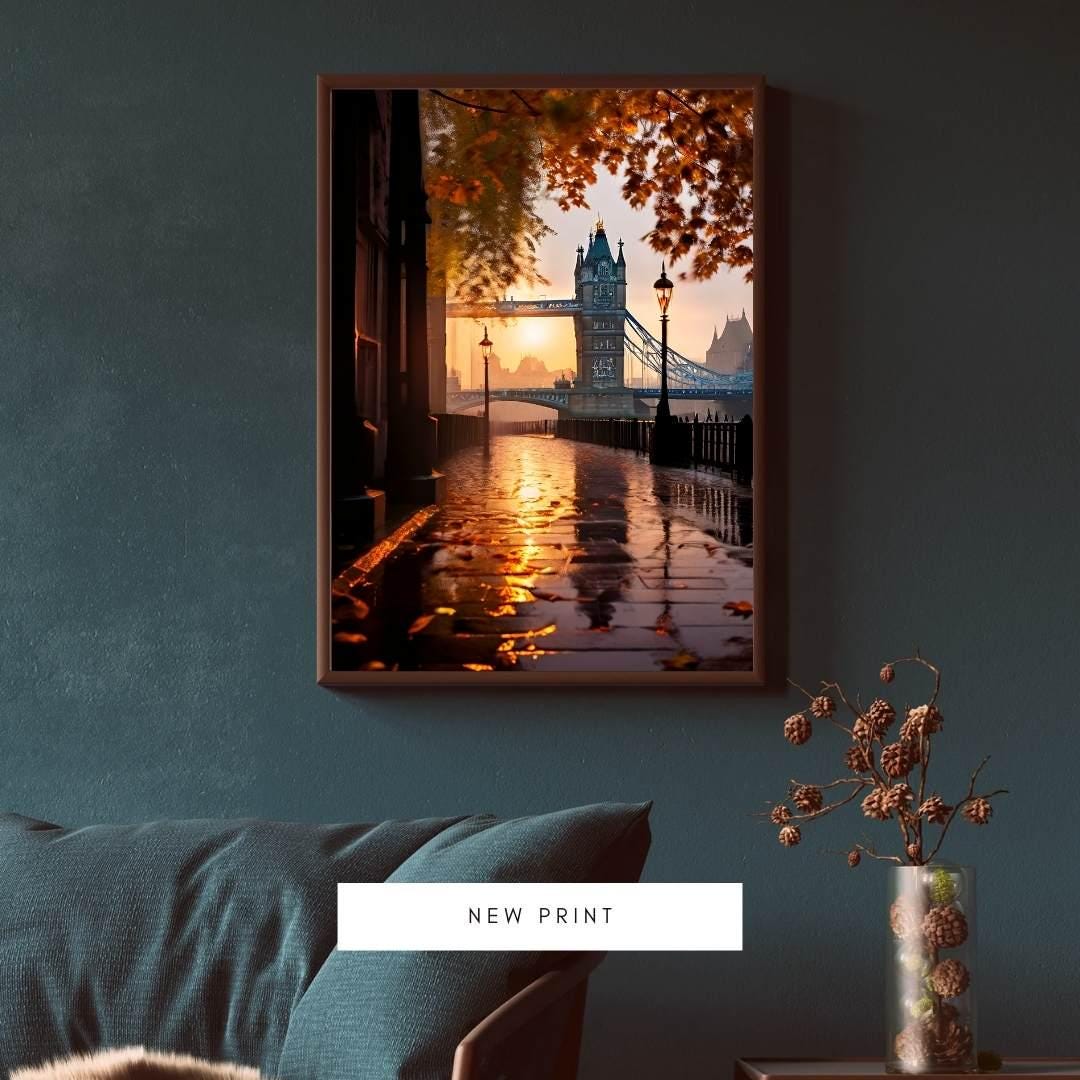 Tower Bridge | London art | Autumn wall decor | Printable cityscape | Fall poster | London skyline | Digital download | Cozy decor | Sunset artwork | City art