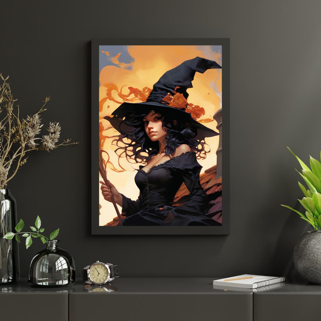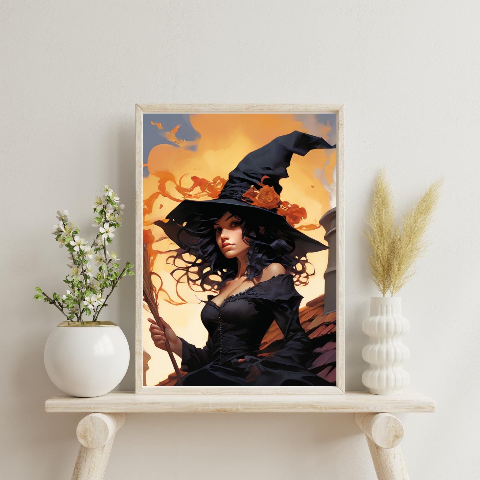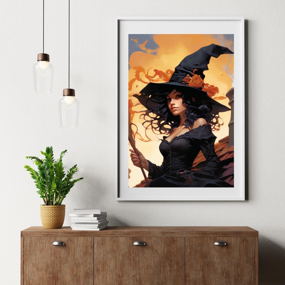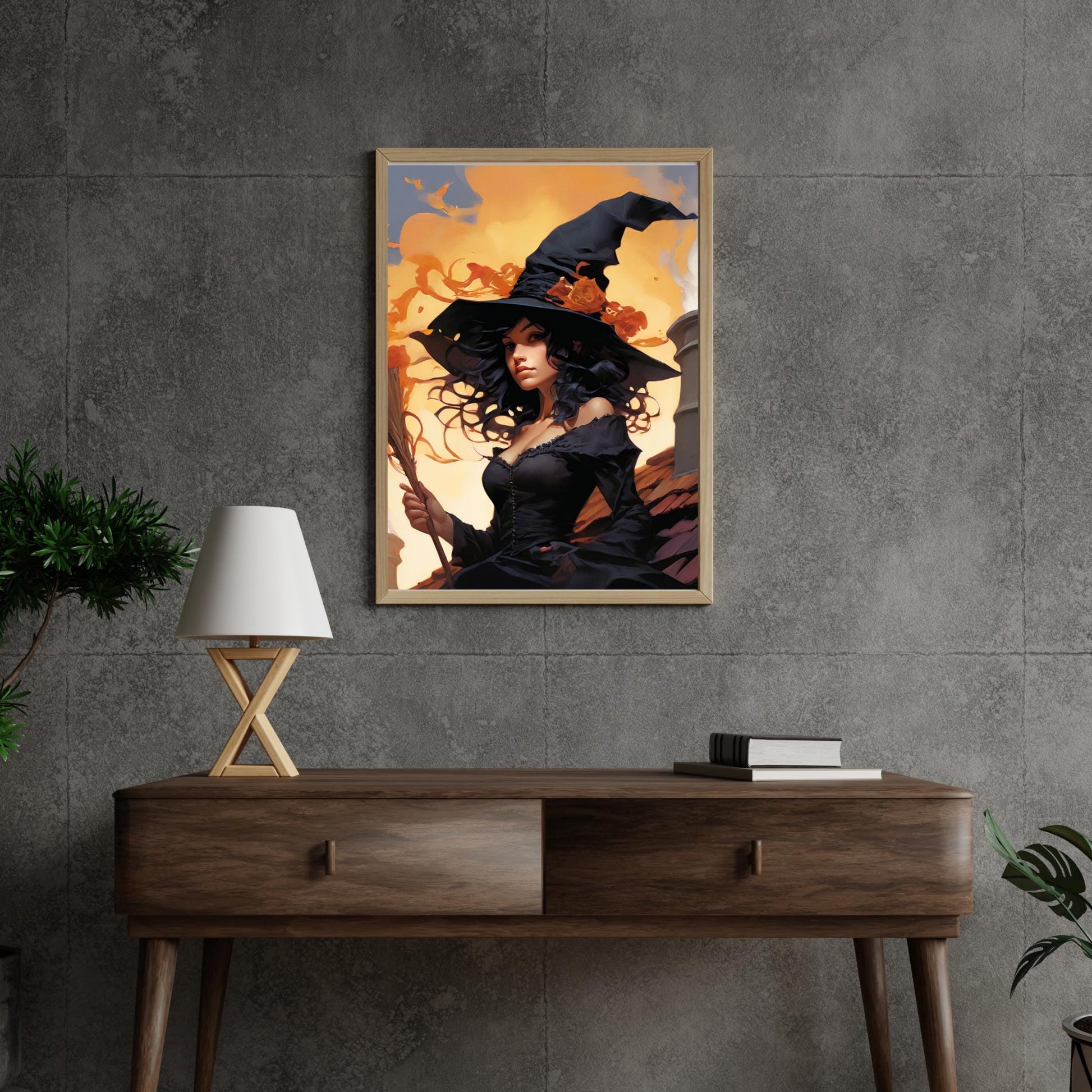 Add a touch of dark elegance to your home with this stunning witch illustration. This gothic-inspired art piece features a powerful feminine witch with flowing hair, wearing a black hat adorned with orange roses, against a sunset background. Created by Tempo Zenith, this digital artwork is perfect for Halloween decor or year-round gothic vibes. The warm tones and enchanting details make it perfect for spooky season, while its dark elegance makes it a great year-round addition to any lover of gothic decor or witchy aesthetics.