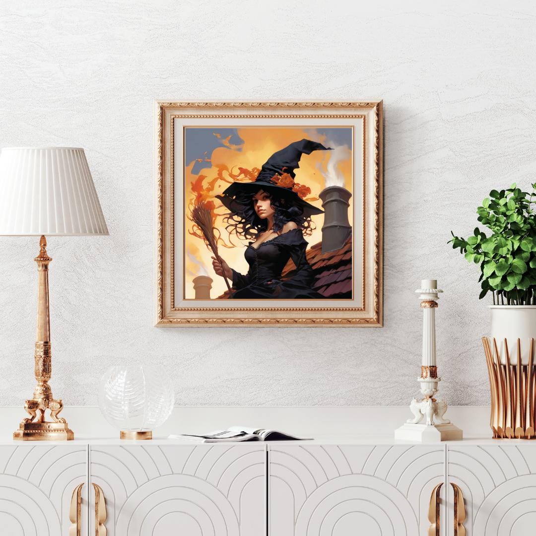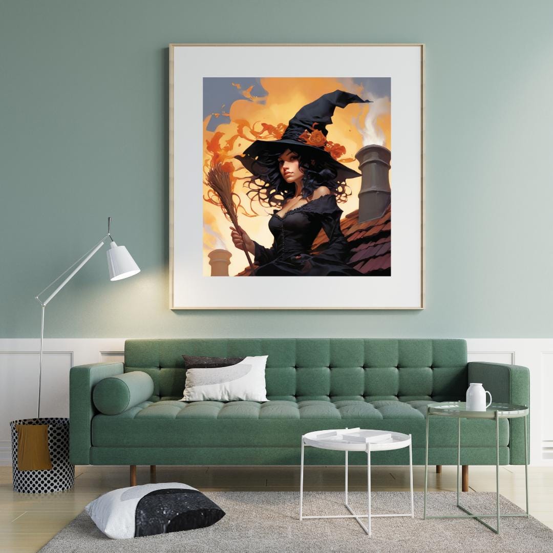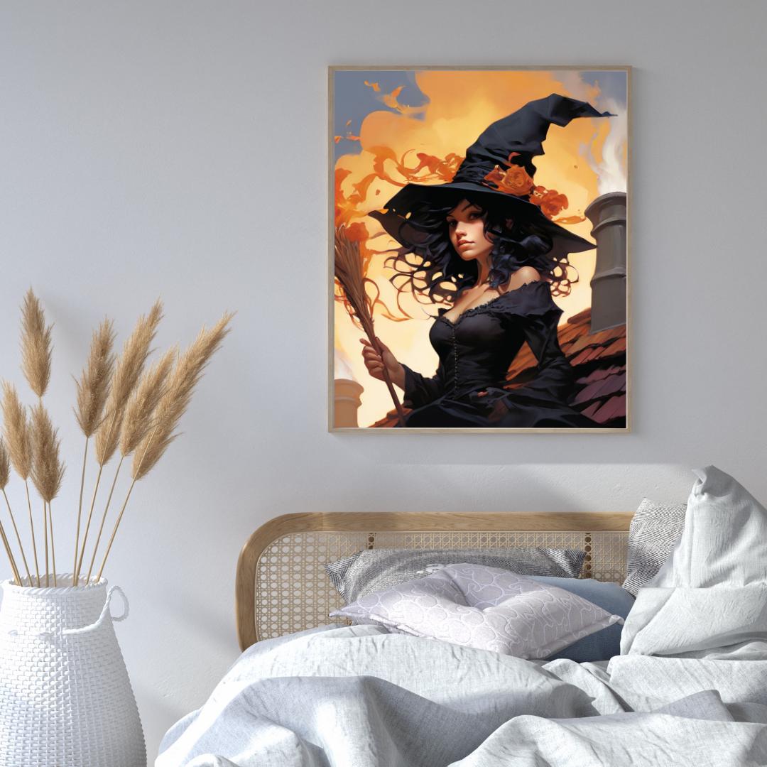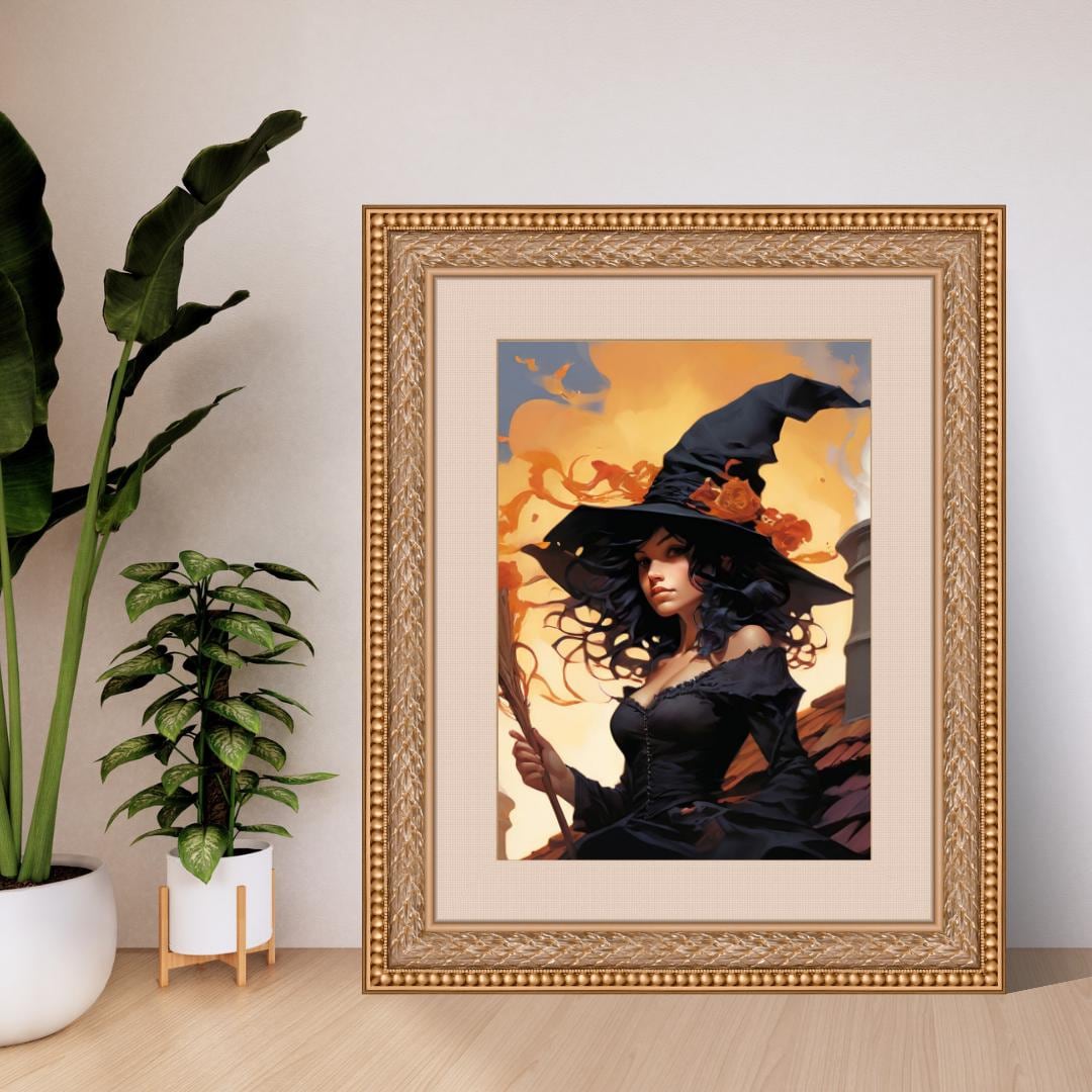 Add a touch of dark elegance to your home with this stunning witch illustration. This gothic-inspired art piece features a powerful feminine witch with flowing hair, wearing a black hat adorned with orange roses, against a sunset background. Created by Tempo Zenith, this digital artwork is perfect for Halloween decor or year-round gothic vibes. The warm tones and enchanting details make it perfect for spooky season, while its dark elegance makes it a great year-round addition to any lover of gothic decor or witchy aesthetics.