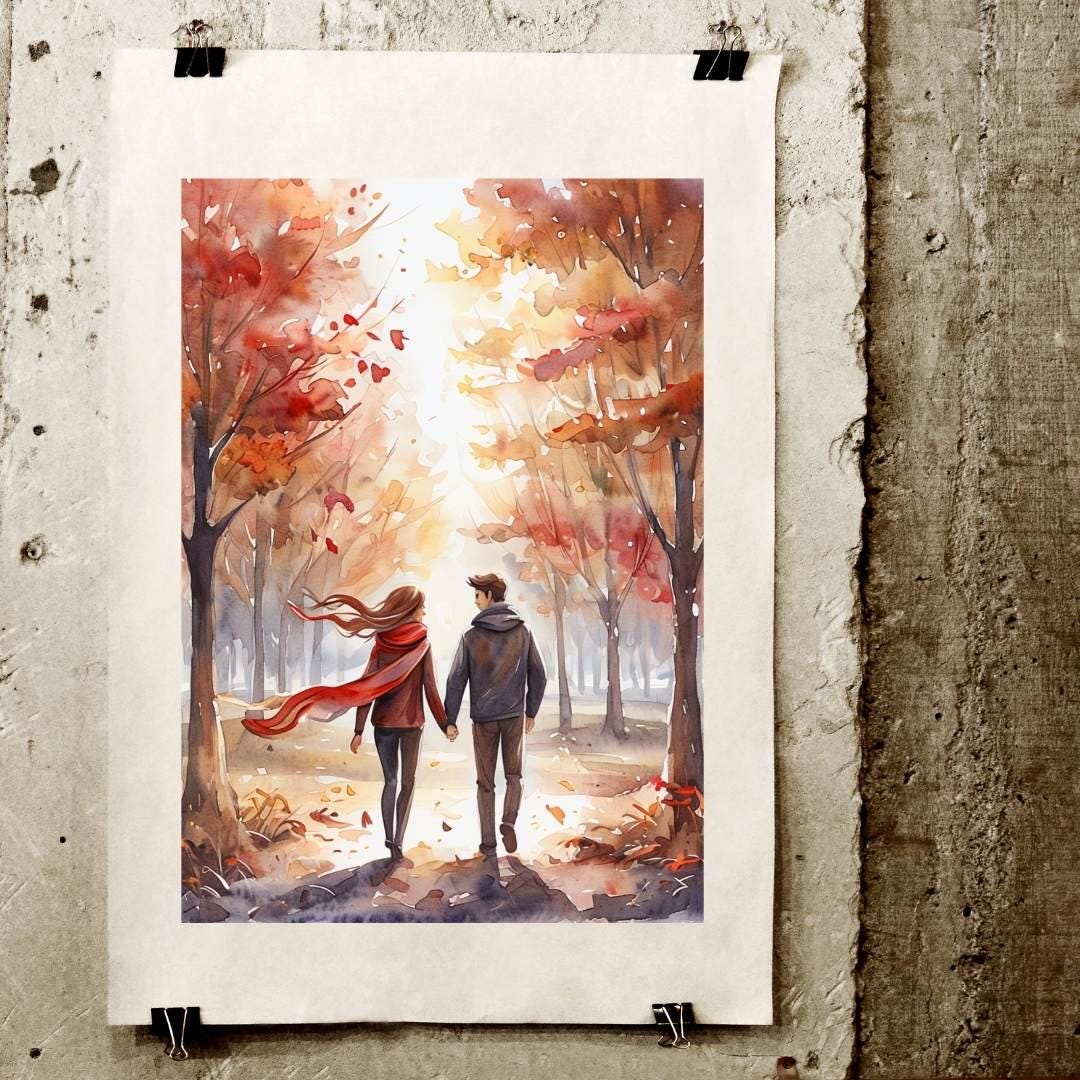 Capture the romance of a crisp autumn day with this beautiful watercolor print of a couple walking hand in hand through a colorful fall landscape. This cozy, seasonal artwork celebrates love and the warm hues of autumn, making it a perfect addition to any room. Ideal for fall lovers and those who appreciate serene, nature-inspired art, this piece brings warmth and charm to your decor.