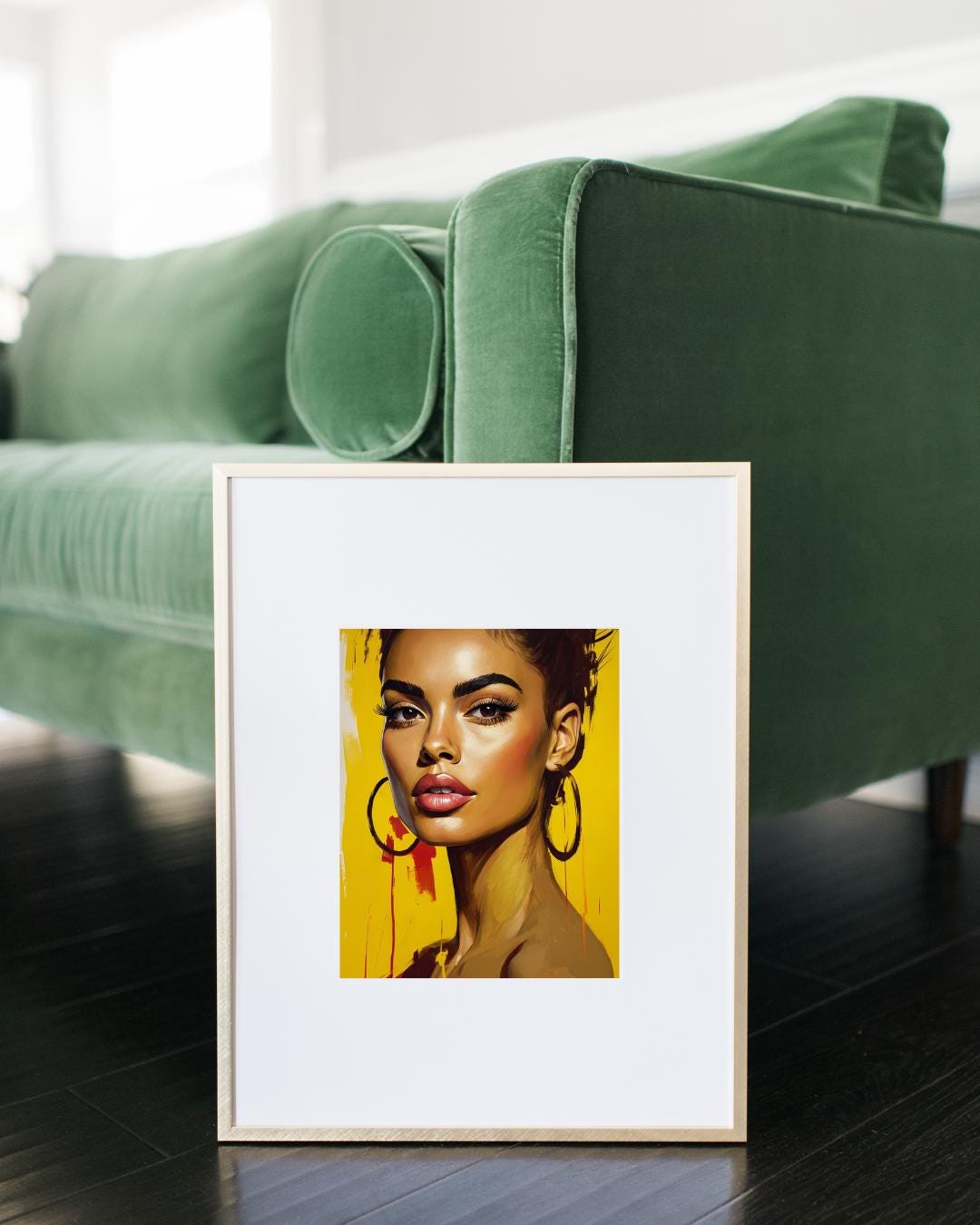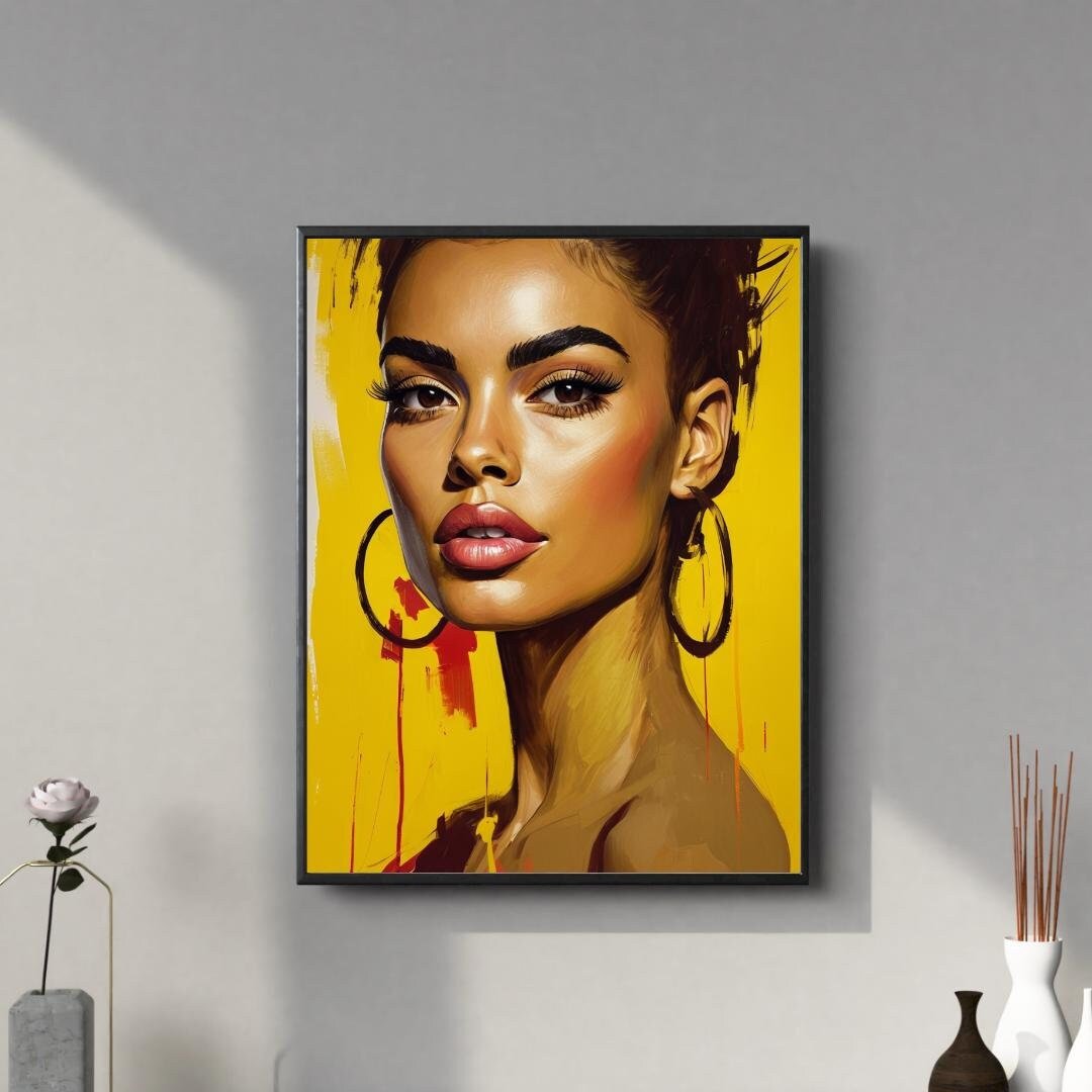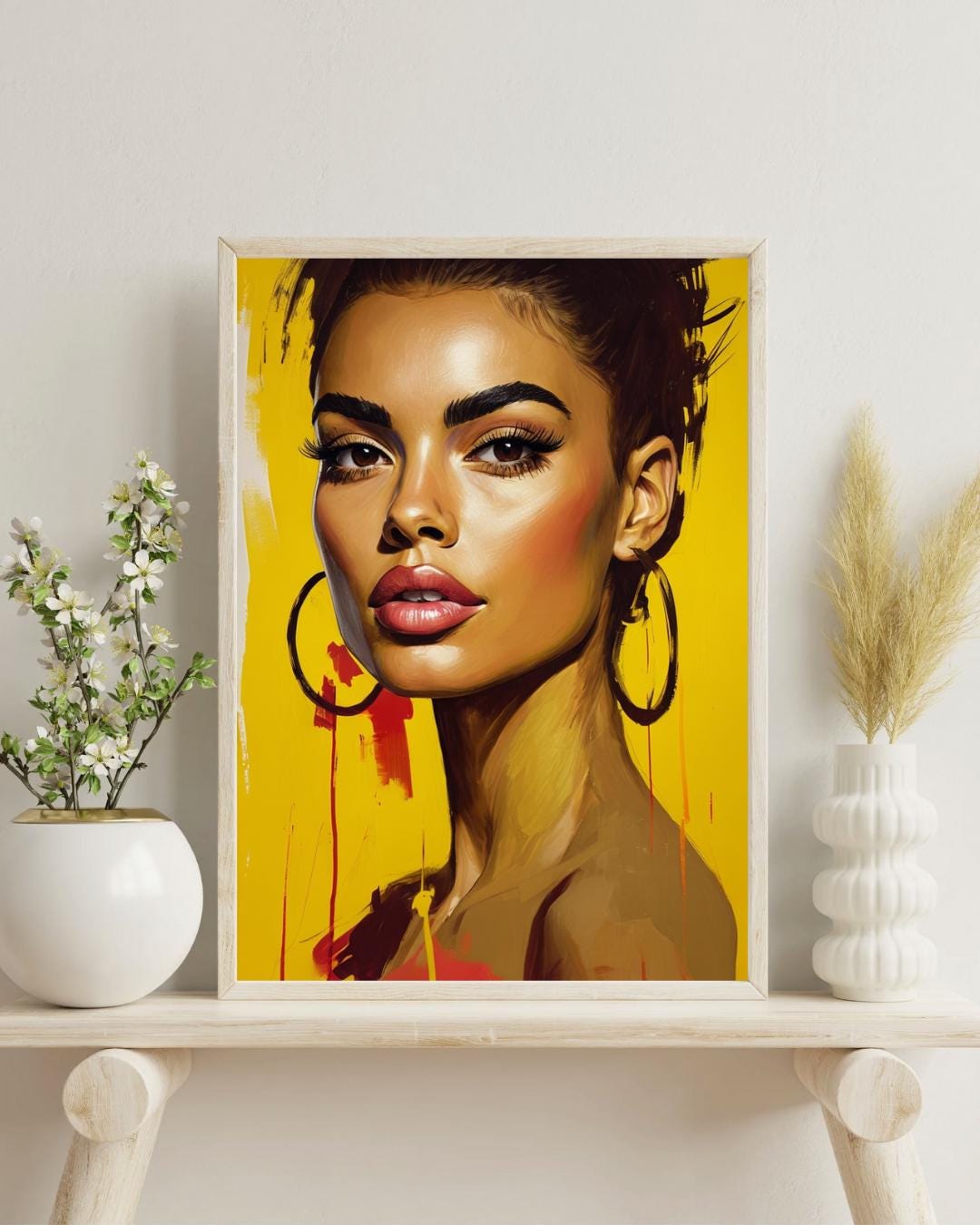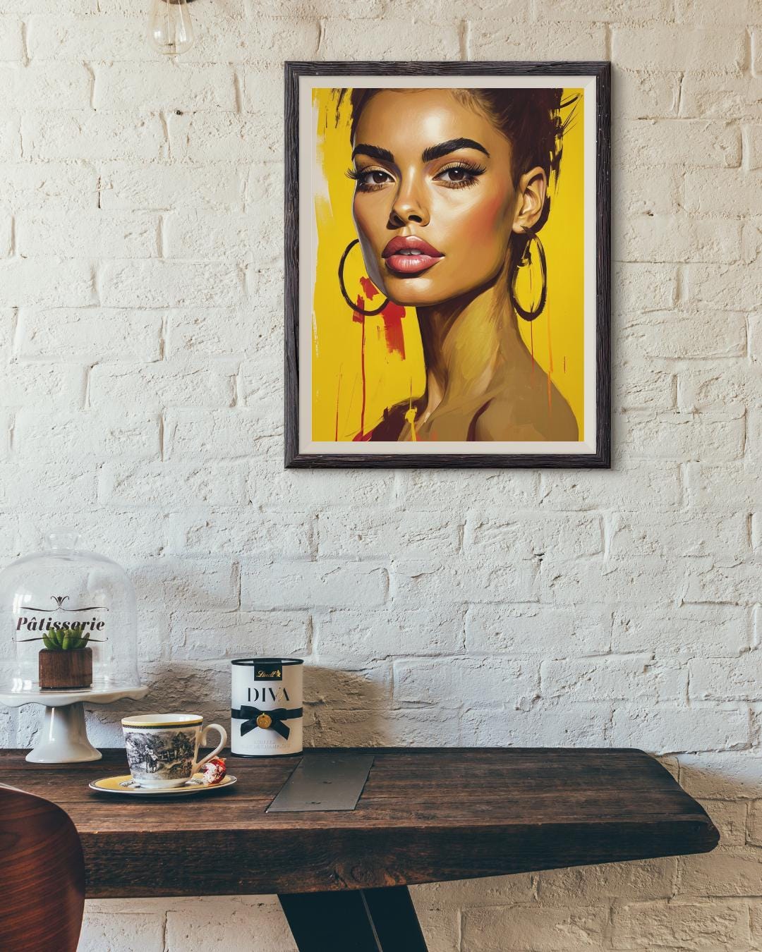 Make a statement with this bold, vibrant portrait of a confident woman, perfect for adding a touch of modern style and elegance to your decor. With expressive brushstrokes and striking colors, this digital fashion illustration brings an artistic flair to any room. Ideal for those who love high fashion and glamour-inspired decor.