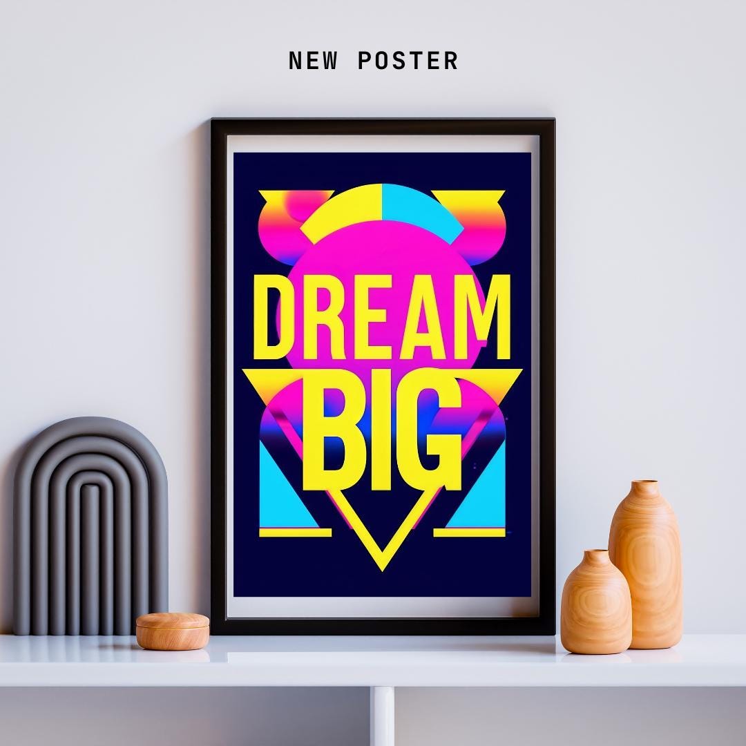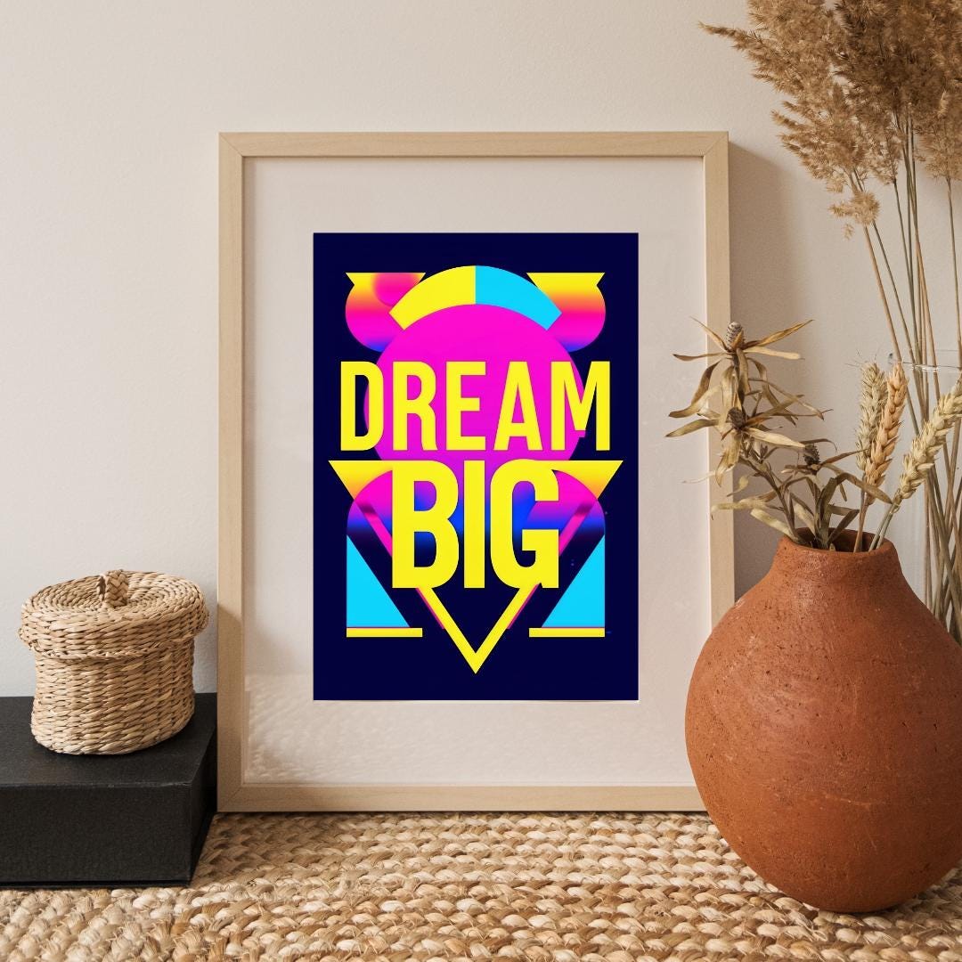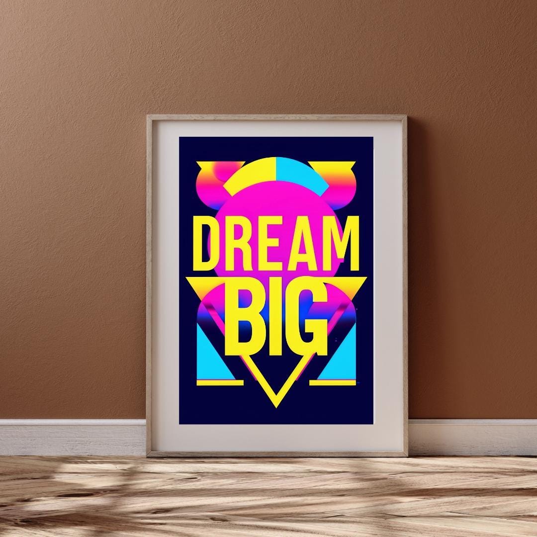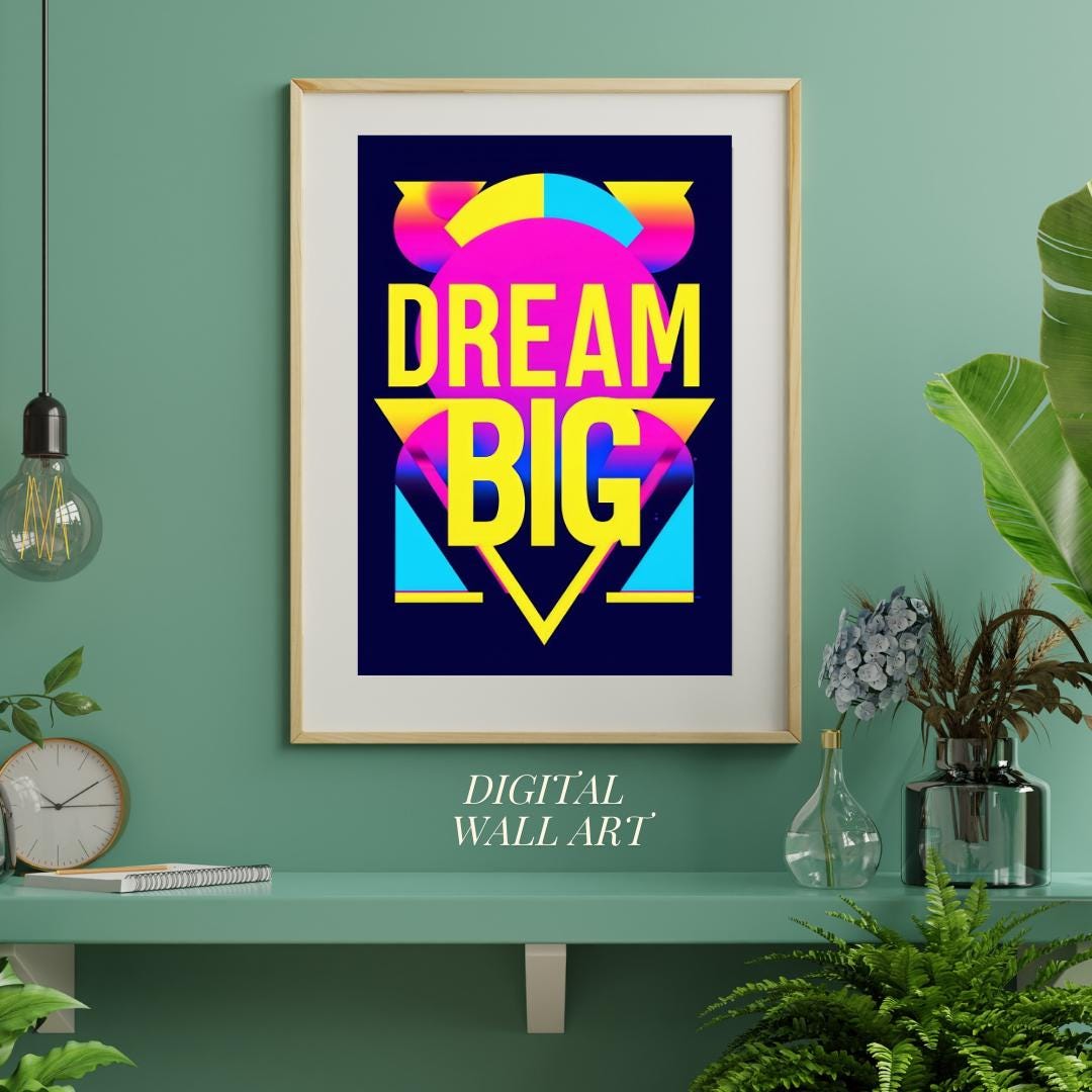 💡🚀 Let your dreams take flight with this "Dream Big" poster! Featuring bold neon colors and striking typography, this poster is a vibrant reminder to think big and go after your goals. Perfect for office spaces, bedrooms, or creative studios, this inspirational print adds a retro pop art vibe to your decor. Whether you’re looking for motivation or adding a splash of color to your walls, this artwork will help you dream big every day. Download, print, and enjoy your new wall art instantly! ✨🎨