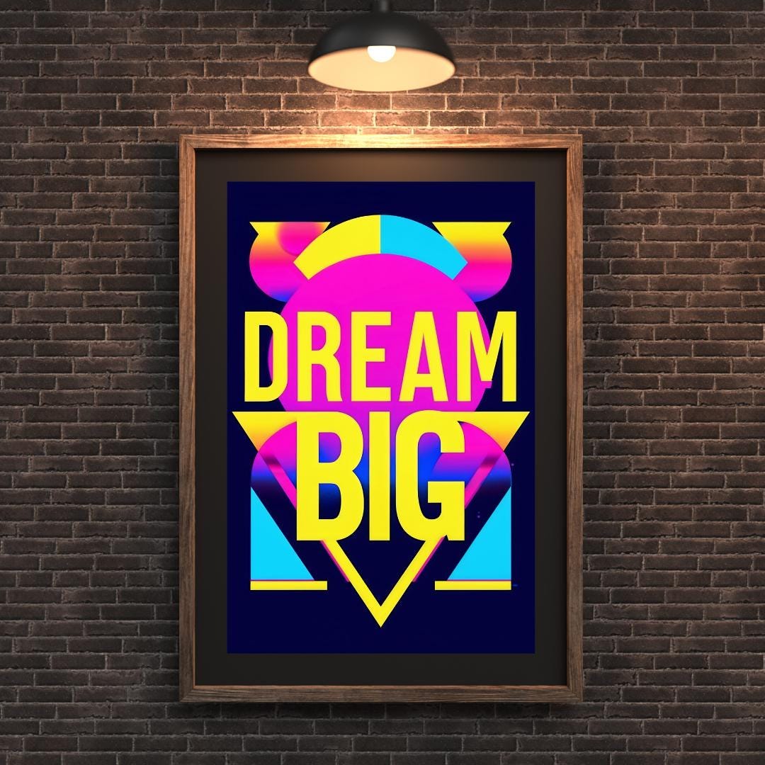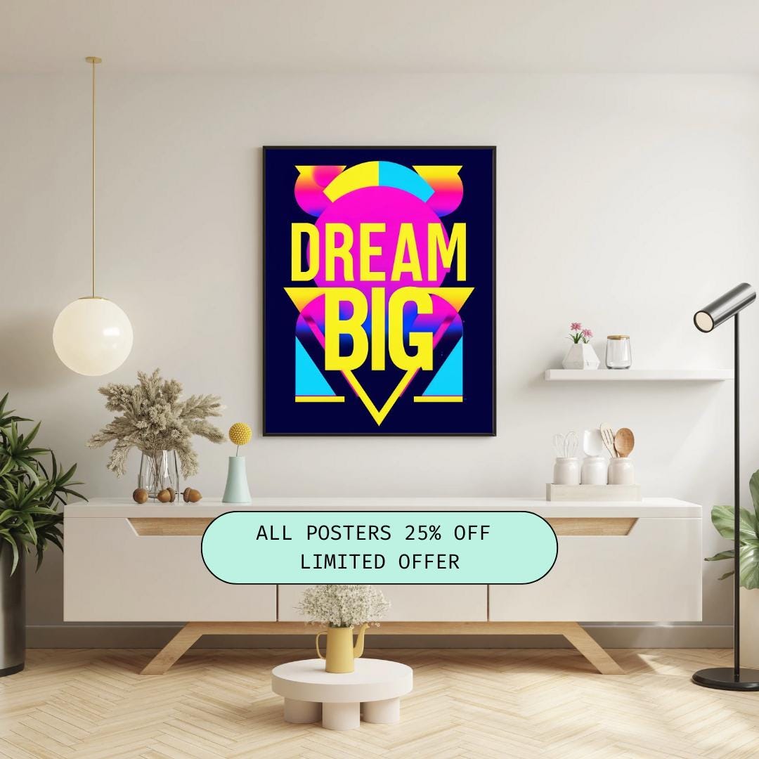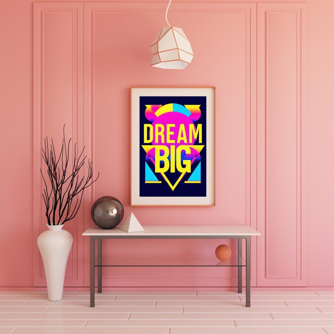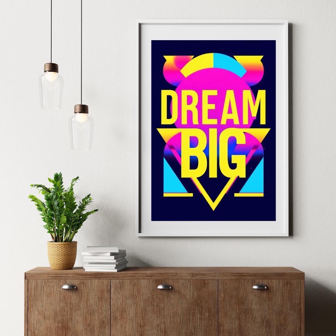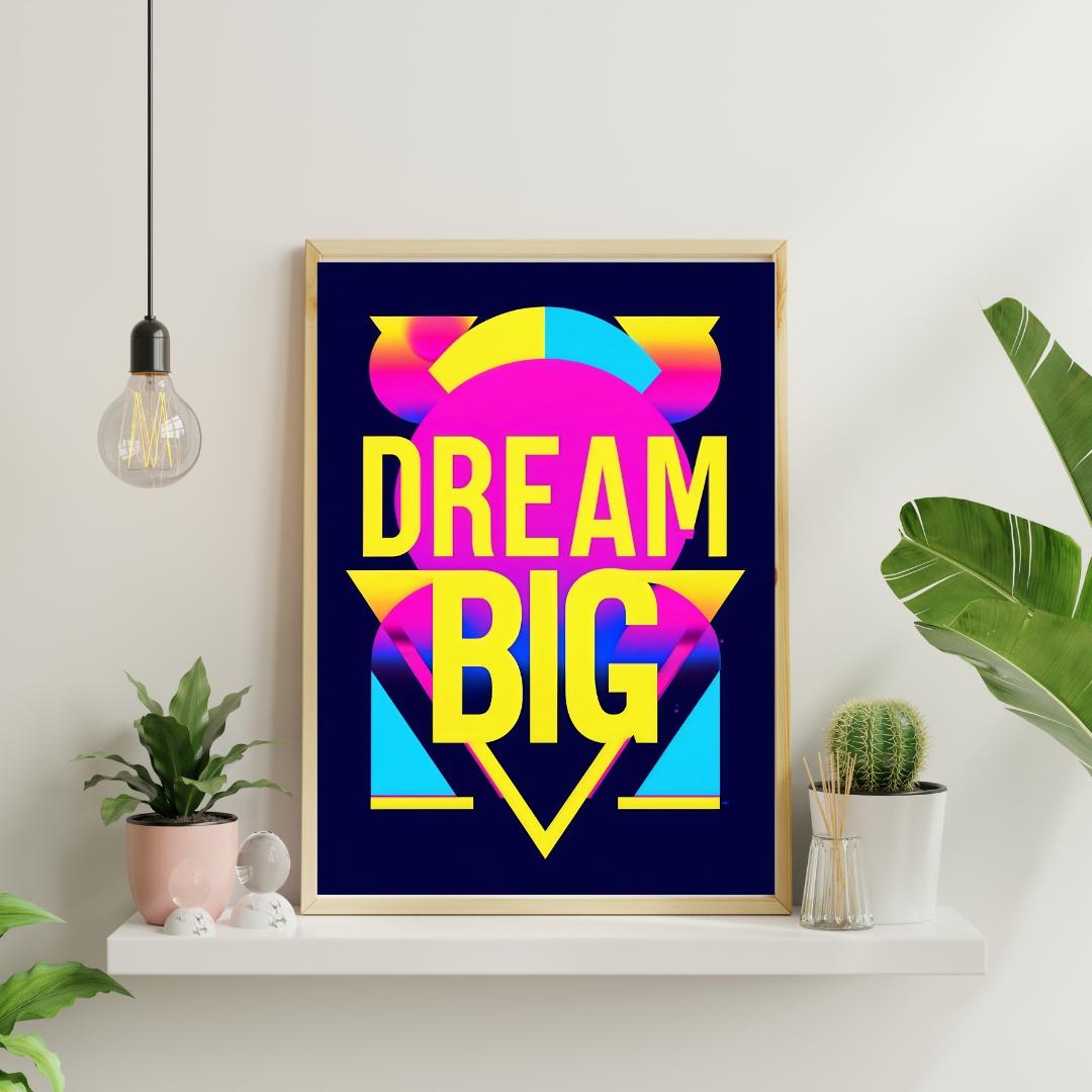 💡🚀 Let your dreams take flight with this "Dream Big" poster! Featuring bold neon colors and striking typography, this poster is a vibrant reminder to think big and go after your goals. Perfect for office spaces, bedrooms, or creative studios, this inspirational print adds a retro pop art vibe to your decor. Whether you’re looking for motivation or adding a splash of color to your walls, this artwork will help you dream big every day. Download, print, and enjoy your new wall art instantly! ✨🎨