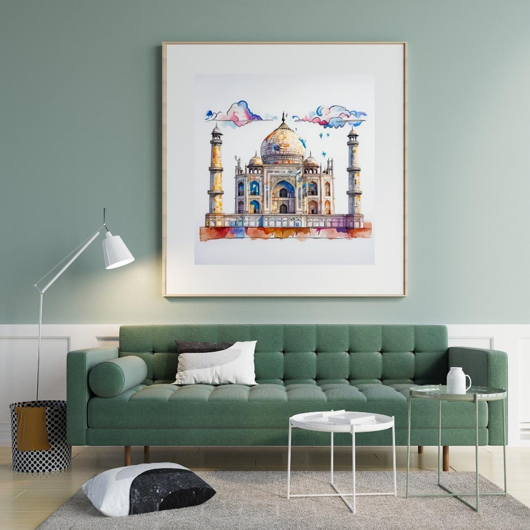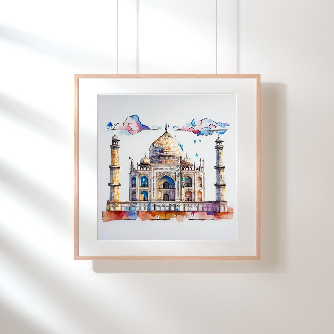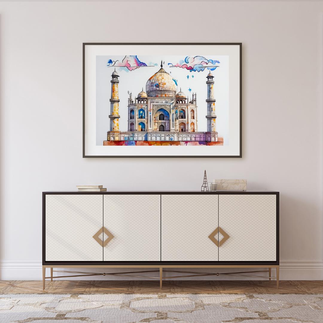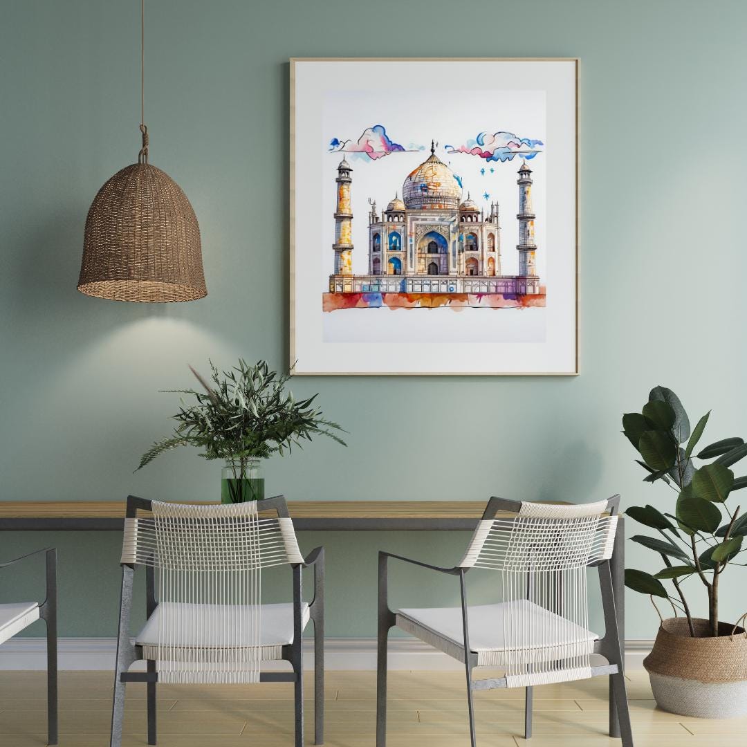 Bring the timeless beauty of the Taj Mahal into your space with this vibrant watercolor art print. Featuring an intricate blend of blues, oranges, and purples, this artwork captures the majestic details of India's most iconic monument with a modern twist. Perfect for living rooms, offices, or study spaces, this print is ideal for anyone who loves architecture, travel, or cultural decor.