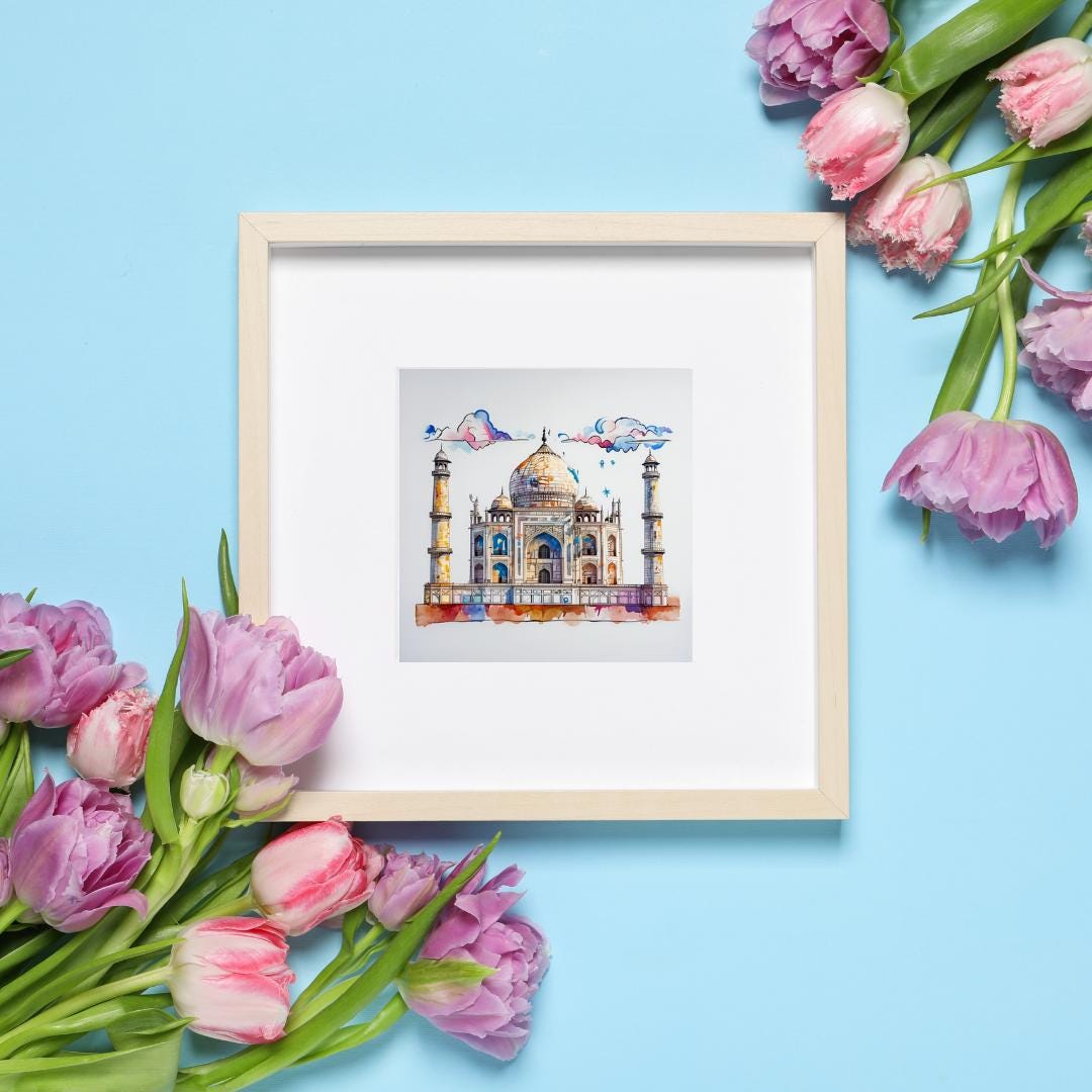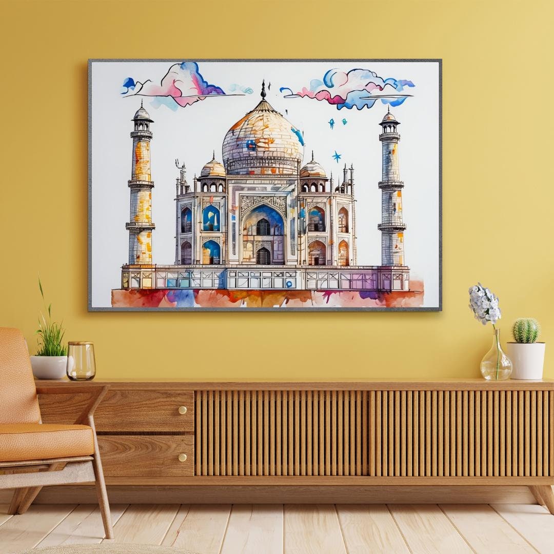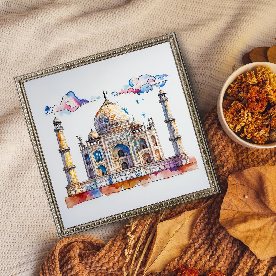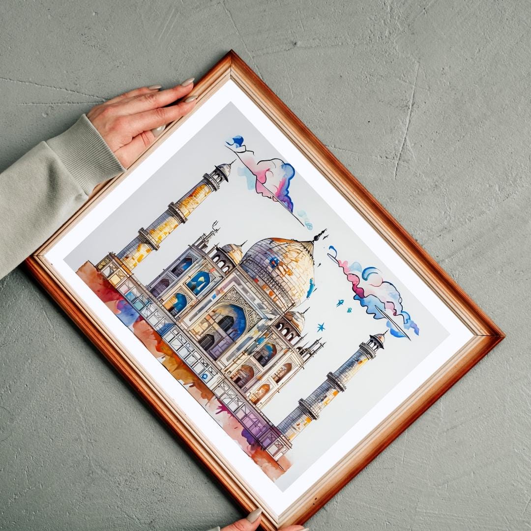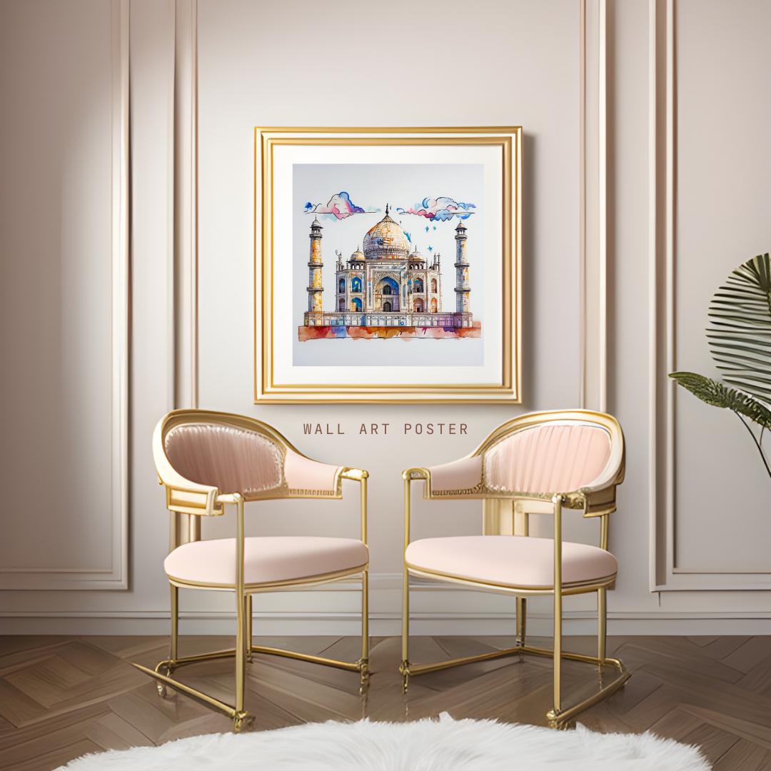 Bring the timeless beauty of the Taj Mahal into your space with this vibrant watercolor art print. Featuring an intricate blend of blues, oranges, and purples, this artwork captures the majestic details of India's most iconic monument with a modern twist. Perfect for living rooms, offices, or study spaces, this print is ideal for anyone who loves architecture, travel, or cultural decor.