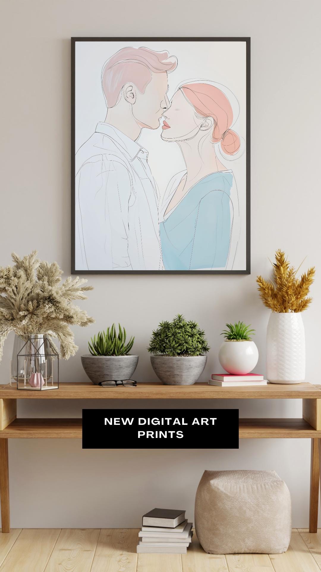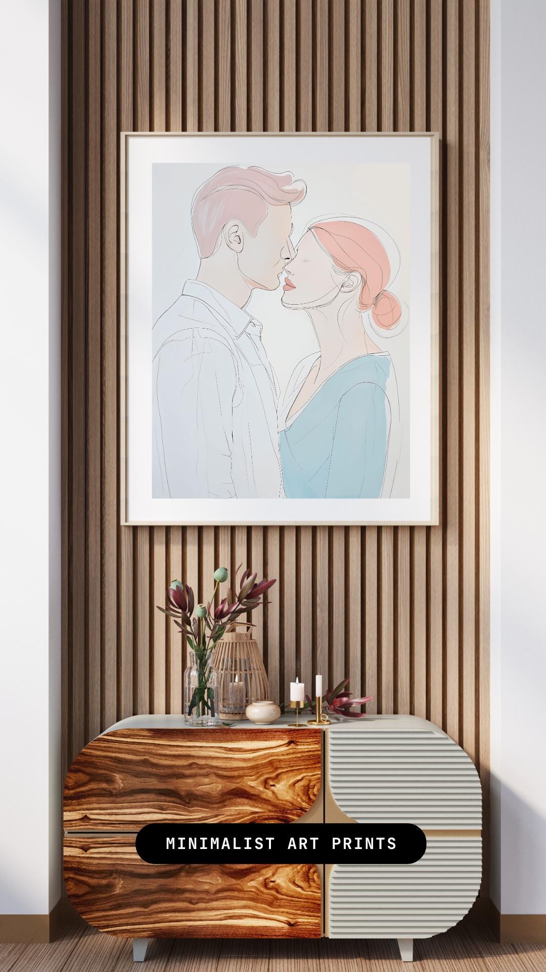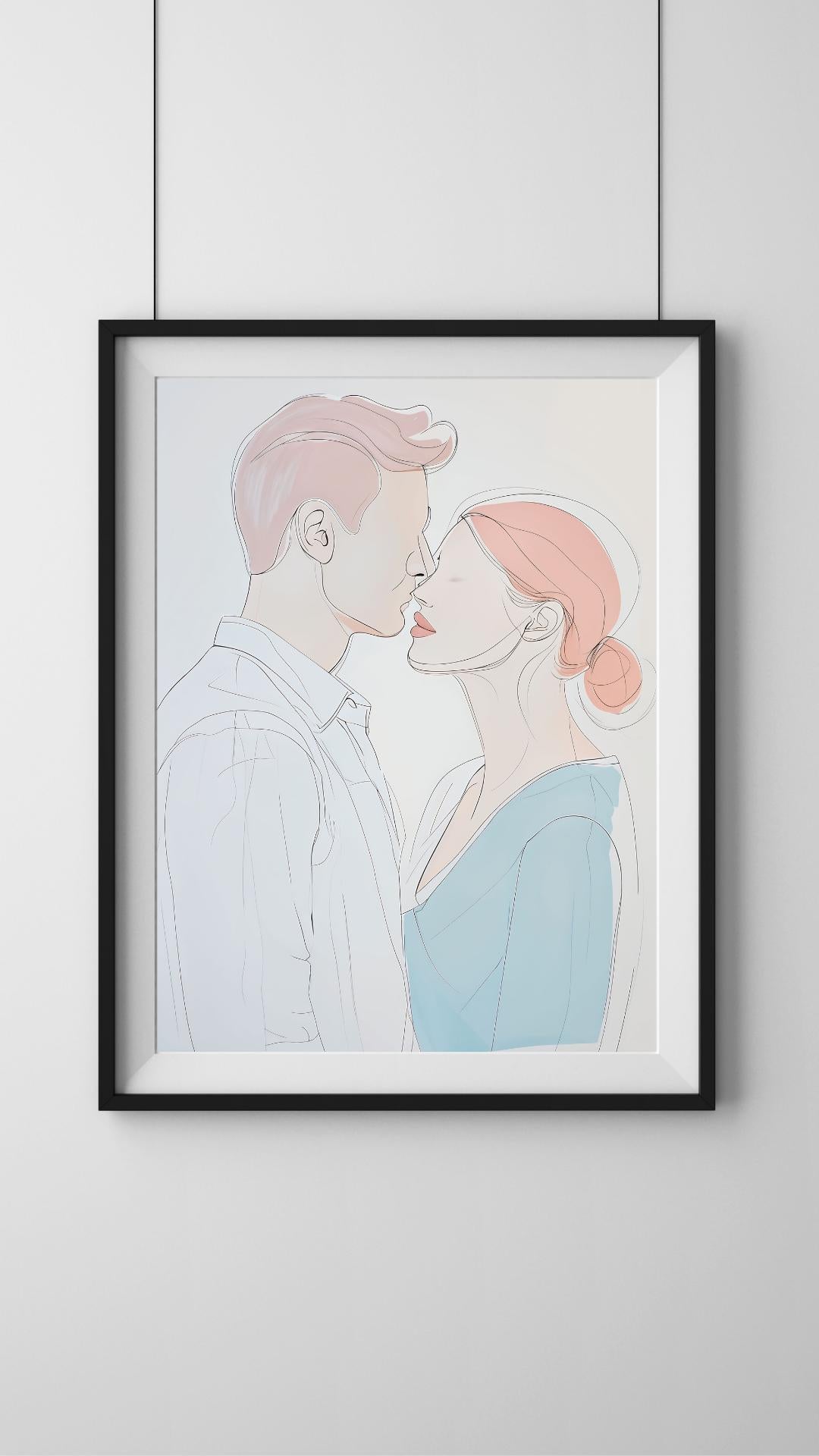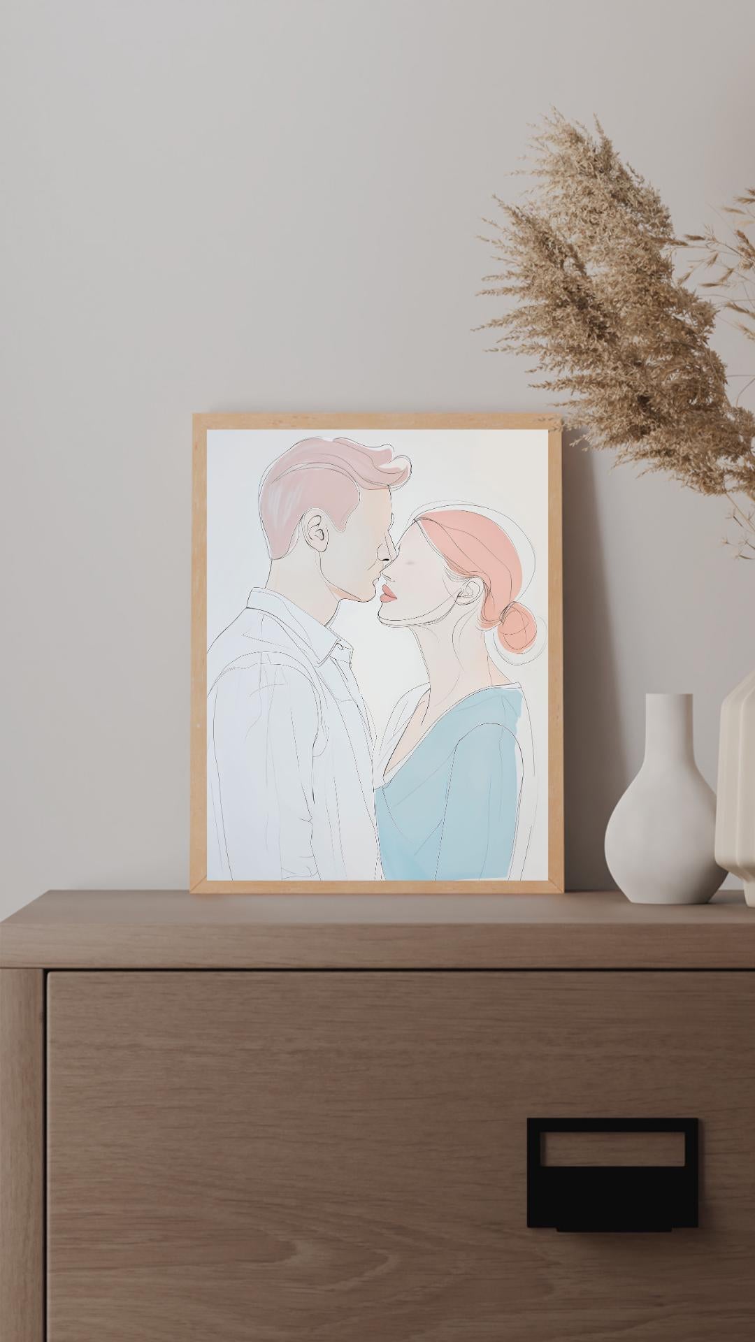 Add a touch of romance and modern elegance to your space with this minimalist couple art print. This faceless portrait captures a tender moment between two figures, beautifully illustrated in soft pastel tones. Perfect for creating a serene and intimate atmosphere, this print is ideal for bedroom or living room decor and makes a thoughtful gift for anniversaries, weddings, or Valentine’s Day.