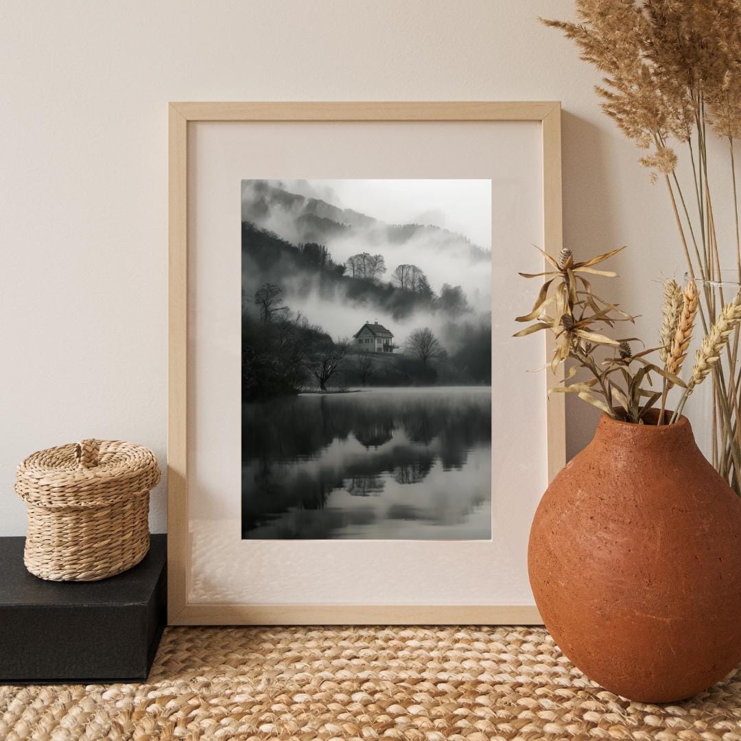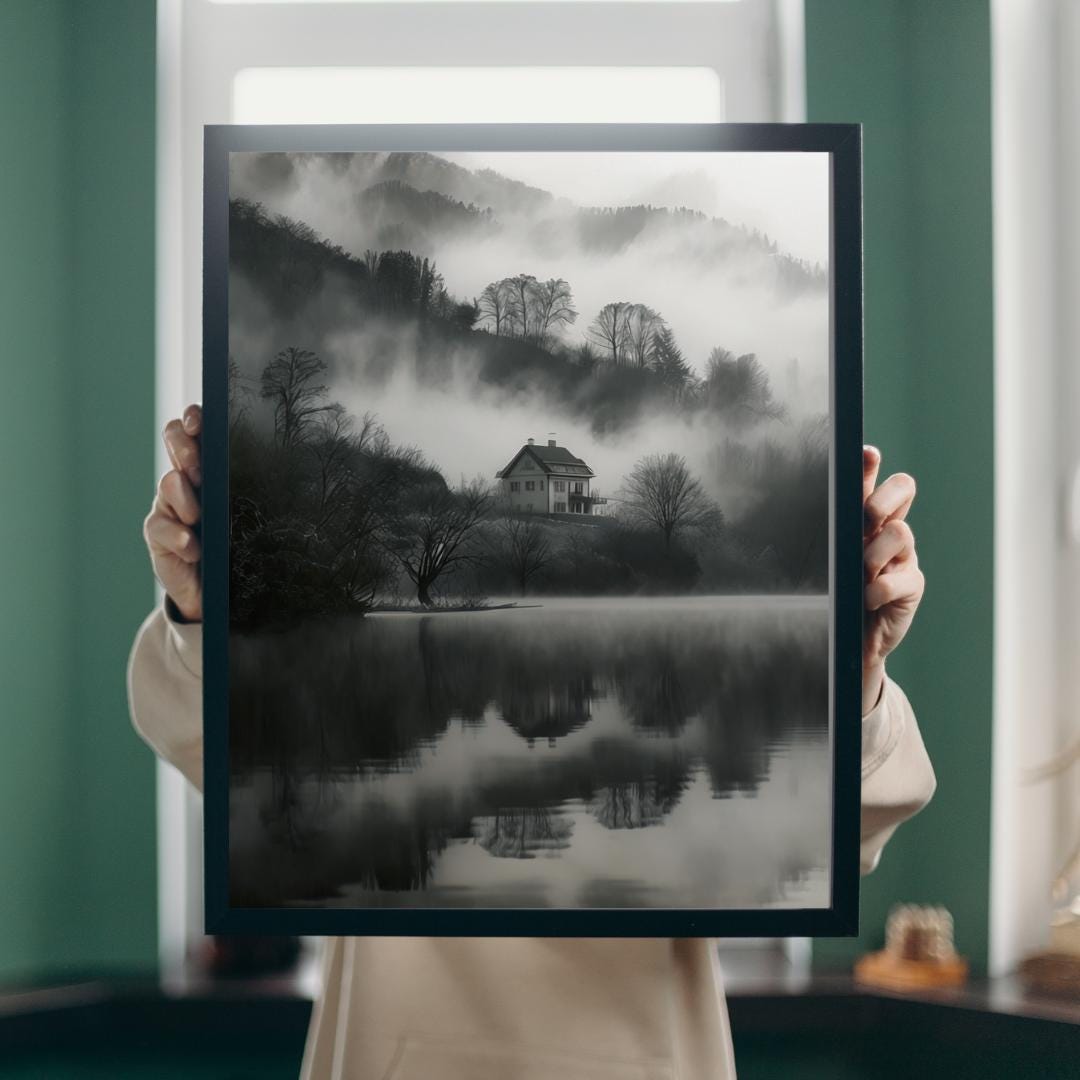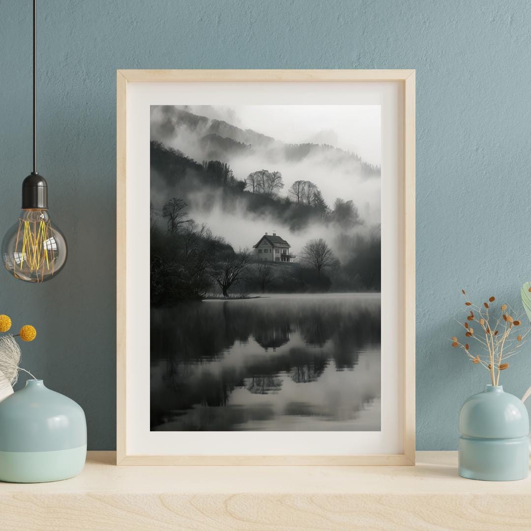 Bring the serene beauty of nature into your home with this 'Misty Lake House' print, a black-and-white digital photograph capturing a solitary house by a misty lake. Surrounded by fog and trees, this peaceful scene is perfect for creating a calming atmosphere in any room. Ideal for minimalist, modern, and Scandinavian-style interiors, this artwork brings a touch of nature's quiet beauty to your space.
