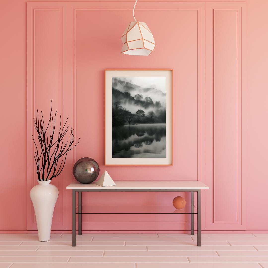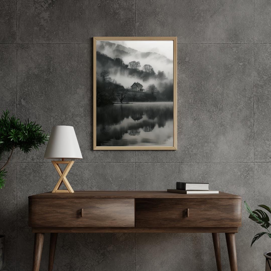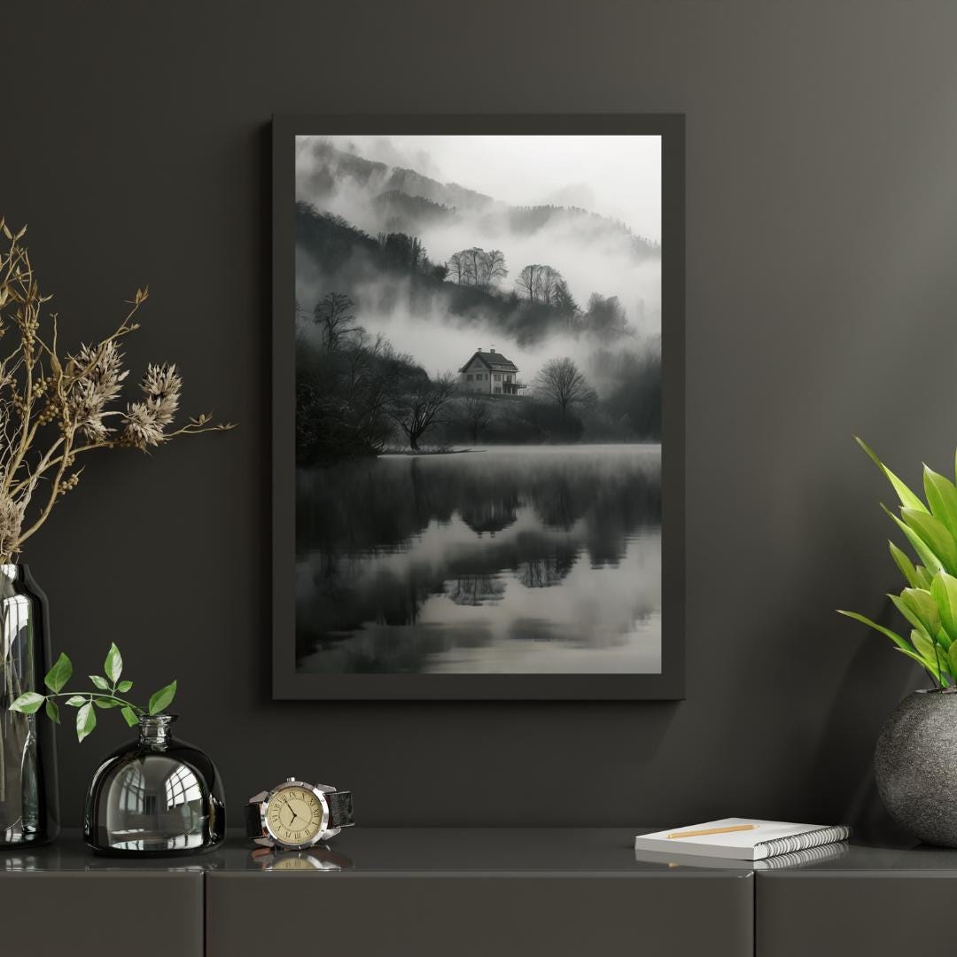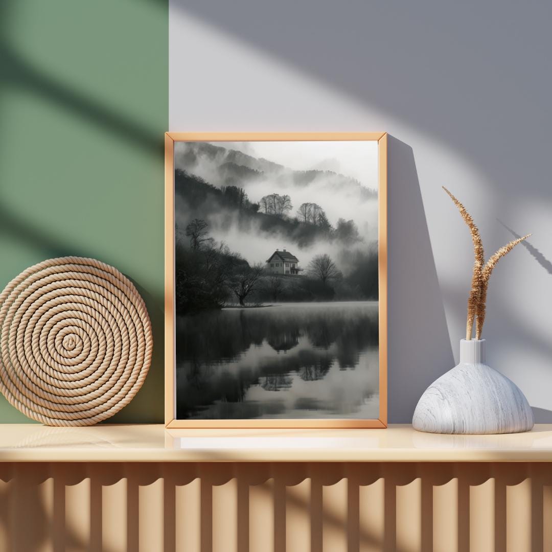 Bring the serene beauty of nature into your home with this 'Misty Lake House' print, a black-and-white digital photograph capturing a solitary house by a misty lake. Surrounded by fog and trees, this peaceful scene is perfect for creating a calming atmosphere in any room. Ideal for minimalist, modern, and Scandinavian-style interiors, this artwork brings a touch of nature's quiet beauty to your space.