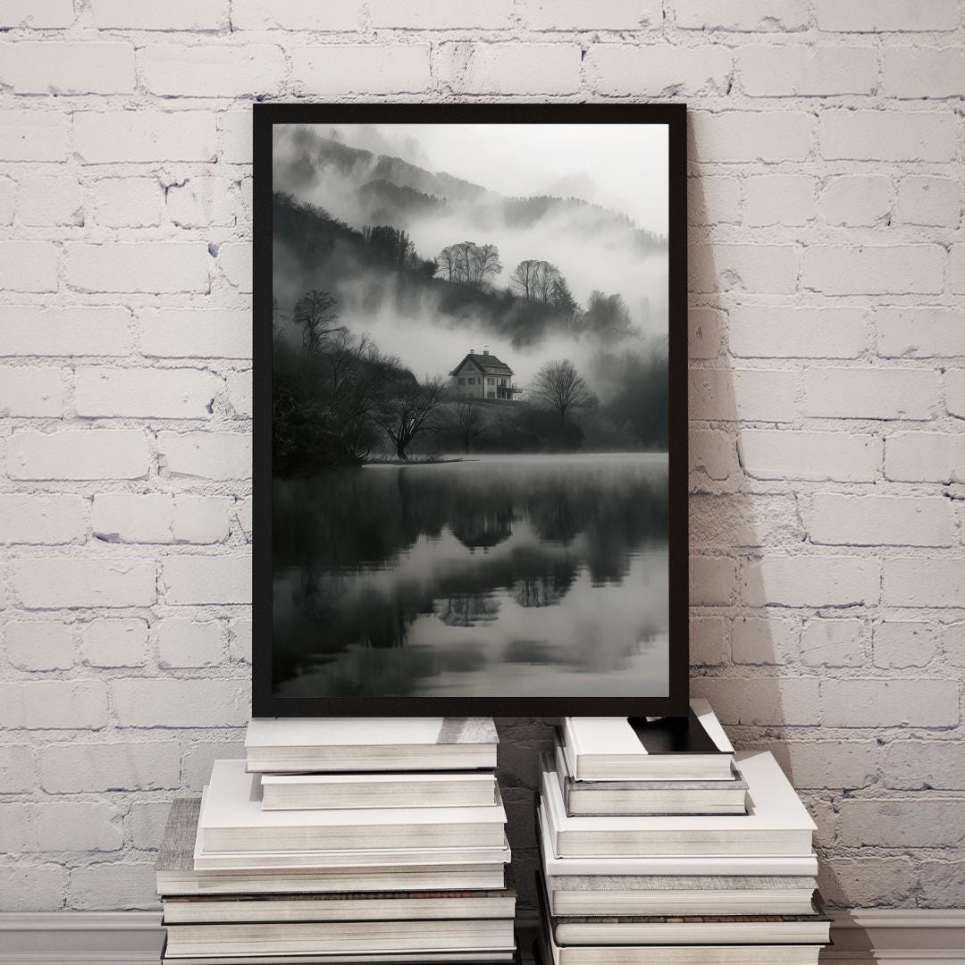 Misty Lake House Print | Tranquil Black and White Nature Art | Serene Landscape Decor