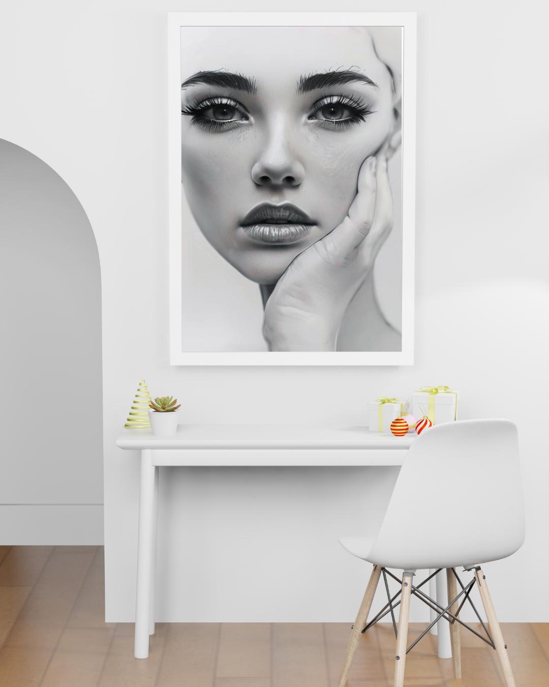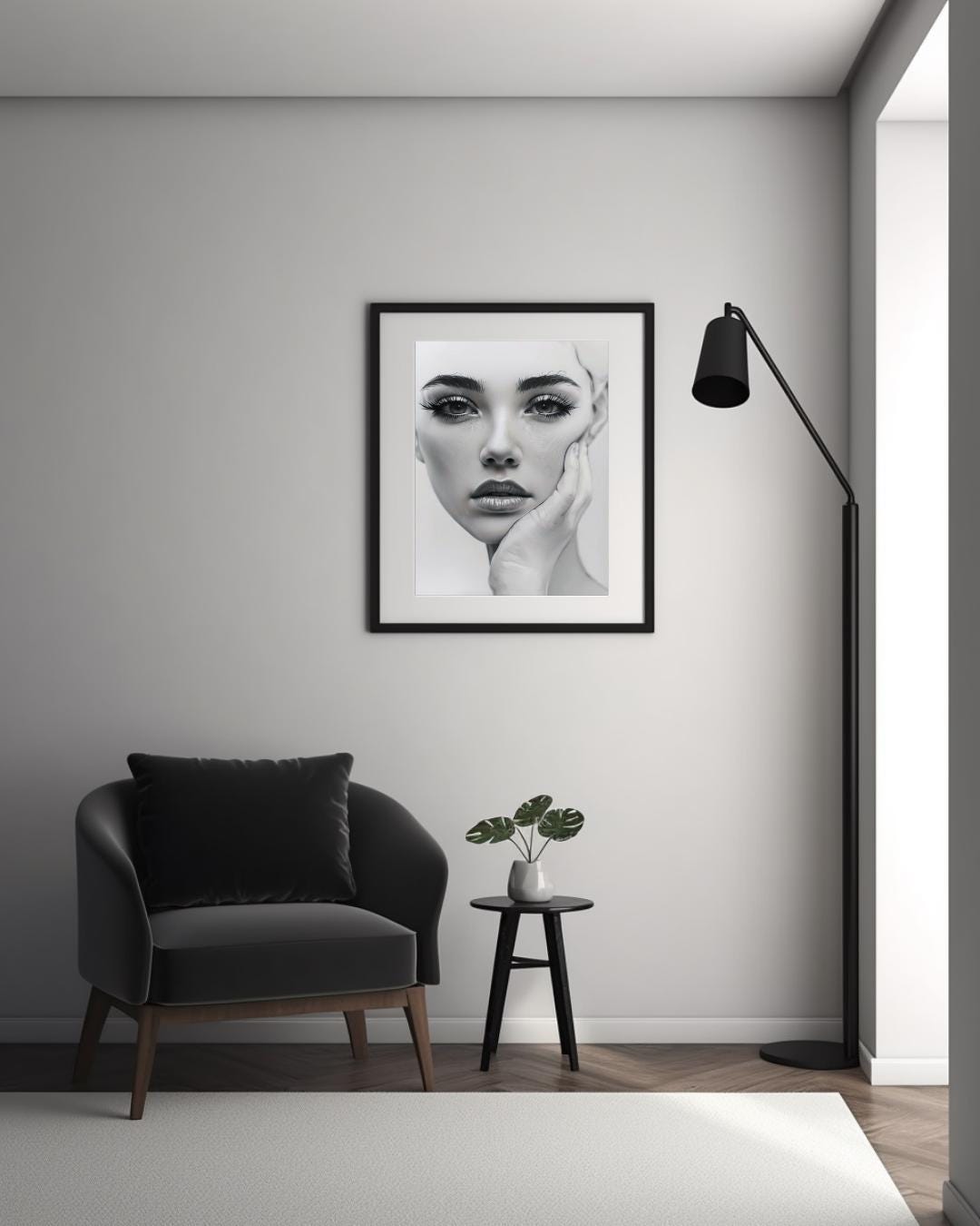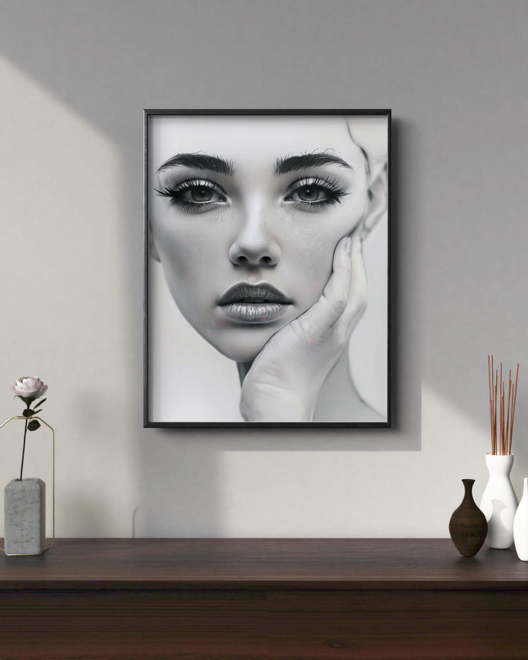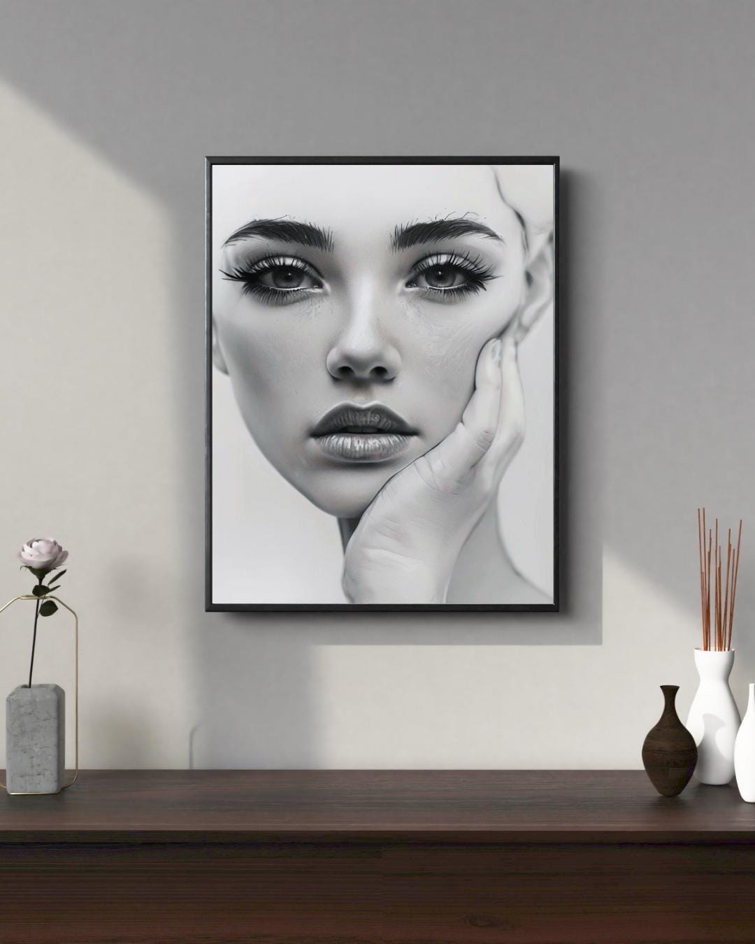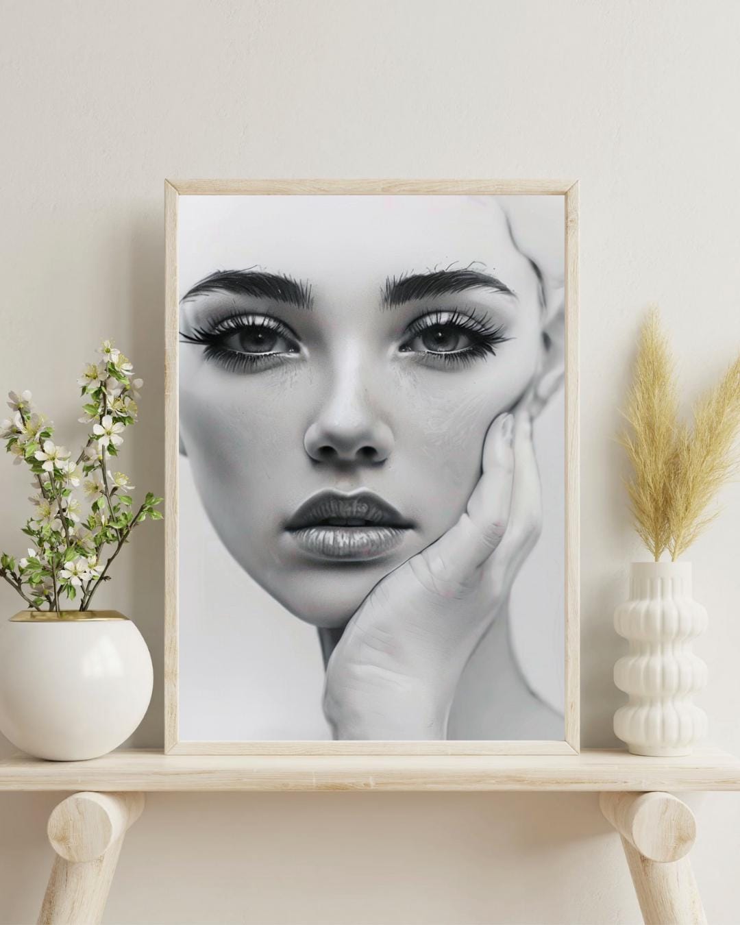 Elevate your space with this striking black and white portrait of a woman’s face, designed in a minimalist style that adds sophistication and elegance to any room. This piece fits perfectly into modern home decor, bringing timeless beauty to your living room, bedroom, or office. Its monochrome design makes it adaptable to various color schemes and settings.