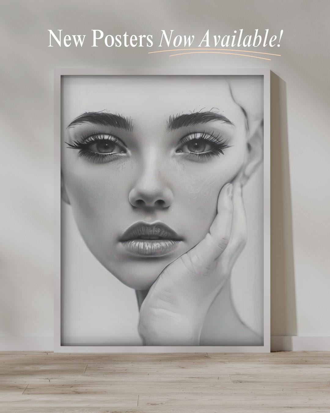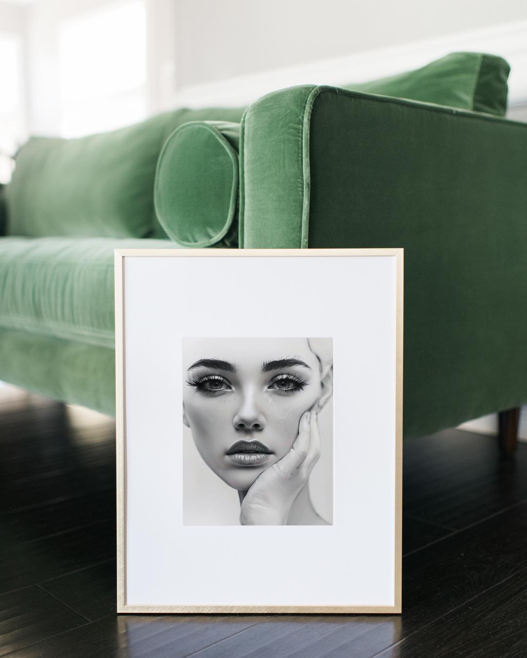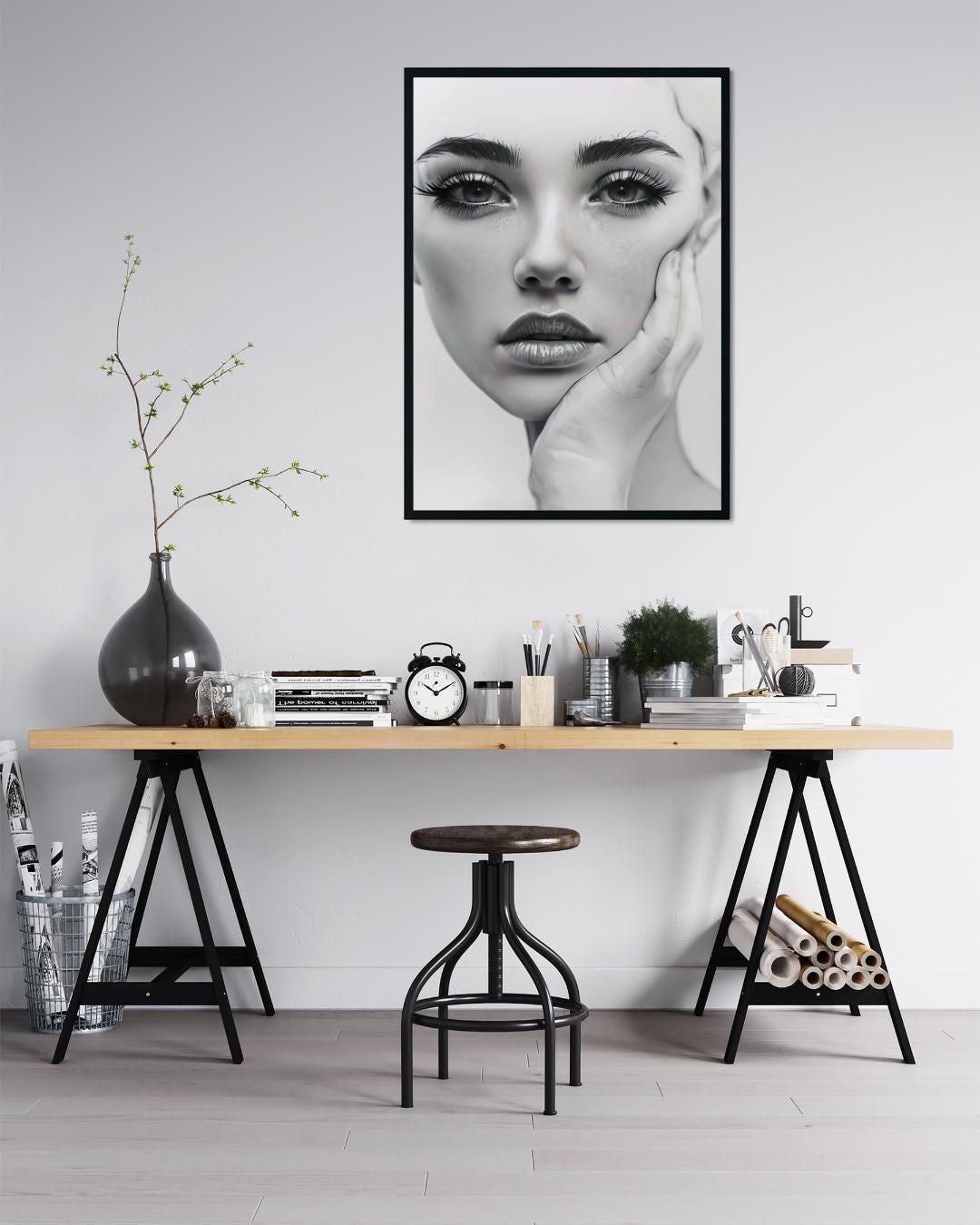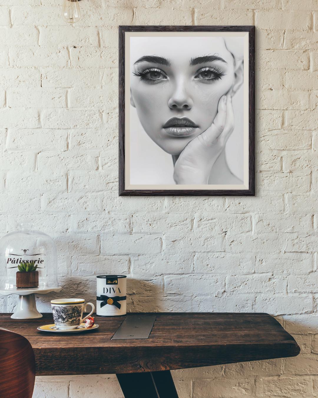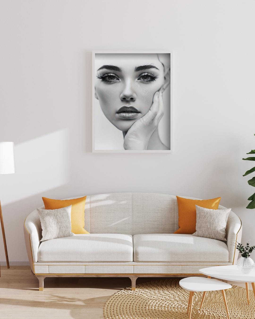 Elevate your space with this striking black and white portrait of a woman’s face, designed in a minimalist style that adds sophistication and elegance to any room. This piece fits perfectly into modern home decor, bringing timeless beauty to your living room, bedroom, or office. Its monochrome design makes it adaptable to various color schemes and settings.