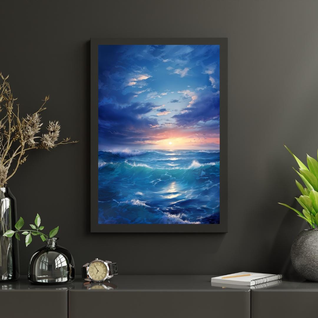Immerse yourself in the calming beauty of the ocean with this serene waves poster. Perfect for lovers of nature and the sea, this stunning print captures the gentle whispers of the ocean waves at dawn, making it the perfect addition to your home decor.