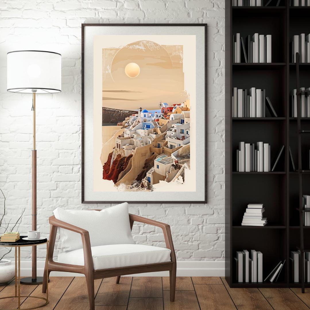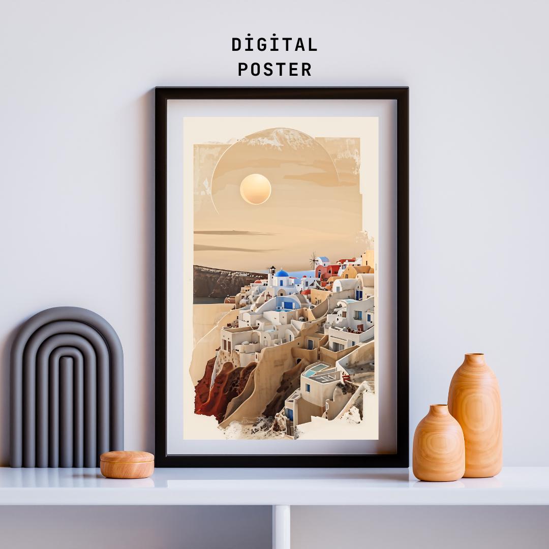 This digital artwork captures a serene sunset over Santorini’s iconic white-washed architecture, perfect for creating a peaceful ambiance in any room. Ideal for living rooms, bedrooms, and offices, this print adds a touch of Mediterranean elegance and travel inspiration.